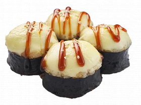 Рис, нори, курица, соус сырный, огурец свежий, сыр чеддер, майонез, соус унаги, кунжут