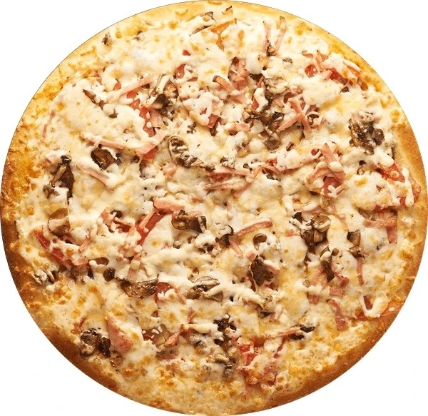 Состав: ветчина, грибы шампиньоны, лук, помидоры, сыр моцарелла, майонез